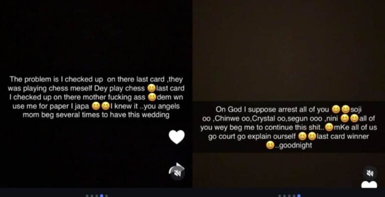 In her own words, she wrote: “The problem is I checked up on there last card, they was playing chess meself Dey play chess last card dem wn I checked up on there mother fucking ass use me for paper I japa I knew it ..you angels