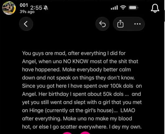 “You guys are mad, after everything I did for Angel, when una NO KNOW most of the shit that have happened. Make everybody better calm down and not speak on things they don’t know. Since you got here I have spent over 100k dols on Angel. Her birthday I spent about 50k dols… and yet you still went and slept with a girl that you met on Hinge (currently at the girl’s house)… LMAO after everything. Make una no make my blood hot, or else I go scatter everywhere. I dey my own.”