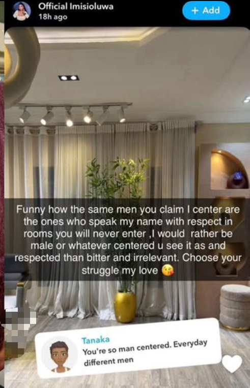 The fan commented, “You are so man centered, everyday different men,” suggesting that Imisi focuses too much on men in her personal life.