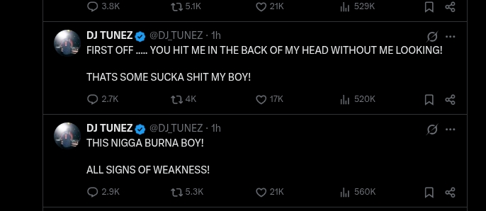 He followed up with another post, stating, “THIS NIGGA BURNA BOY! ALL SIGNS OF WEAKNESS!”