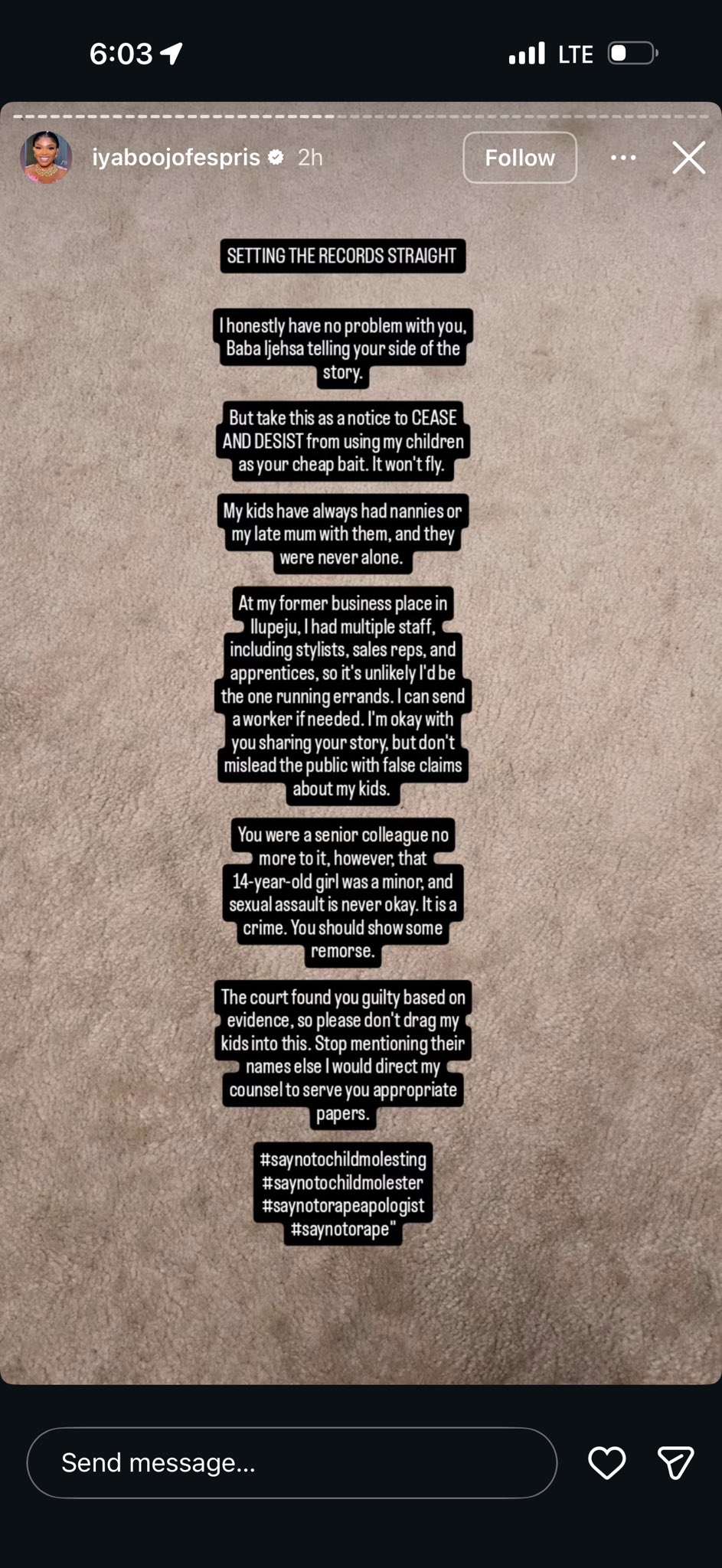 Nollywood actress Iyabo Ojo has fired back at Baba Ijesha after he claimed her children were once under his care, issuing a stern warning to keep them out of his narrative.