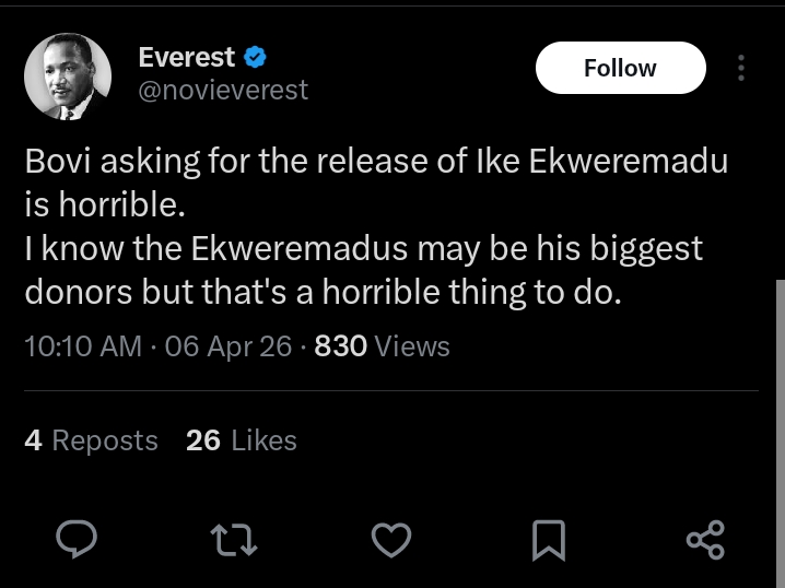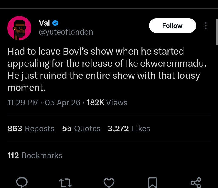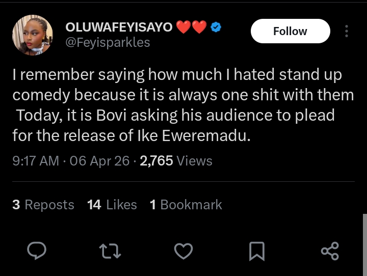 Another commentator shared frustration with the comedy scene, adding: “I remember saying how much I hated stand‑up comedy because it is always one mess with them. Today, it is Bovi asking his audience to plead for the release of Ike Ekweremadu.”