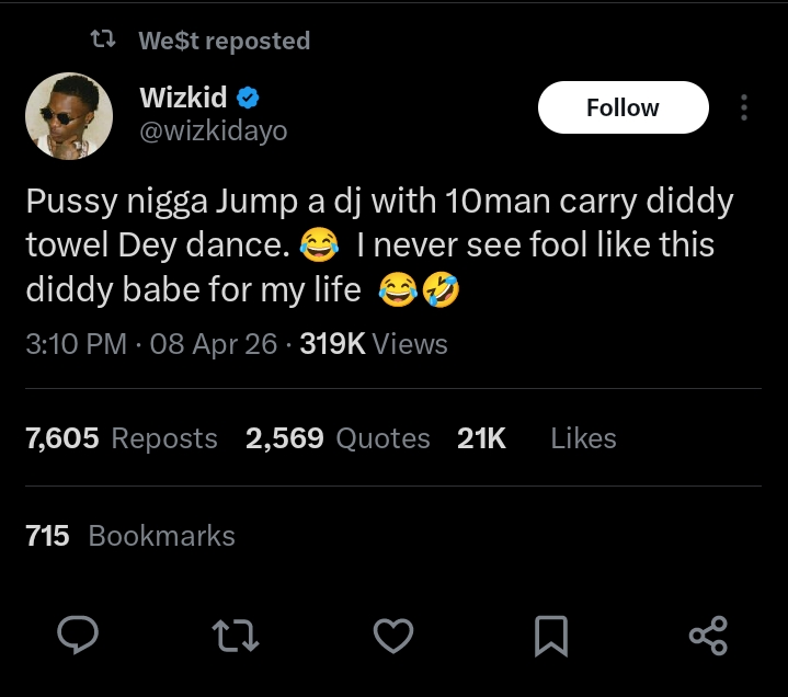 The phrase “diddy babe” is a nickname frequently associated with Burna Boy, making it evident that Wizkid’s message was directed at him. The tweet has ignited reactions across social media, as fans continue to dissect the clash and the tension between the two music camps. Burna Boy has yet to publicly respond to Wizkid’s remarks.