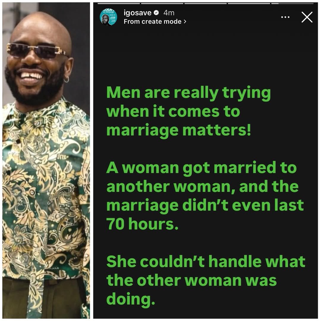 Comedian I Go Save has reacted to the viral breakup drama involving BBNaija star Angel and her alleged lesbian partner, adding his voice to the ongoing social media conversation.