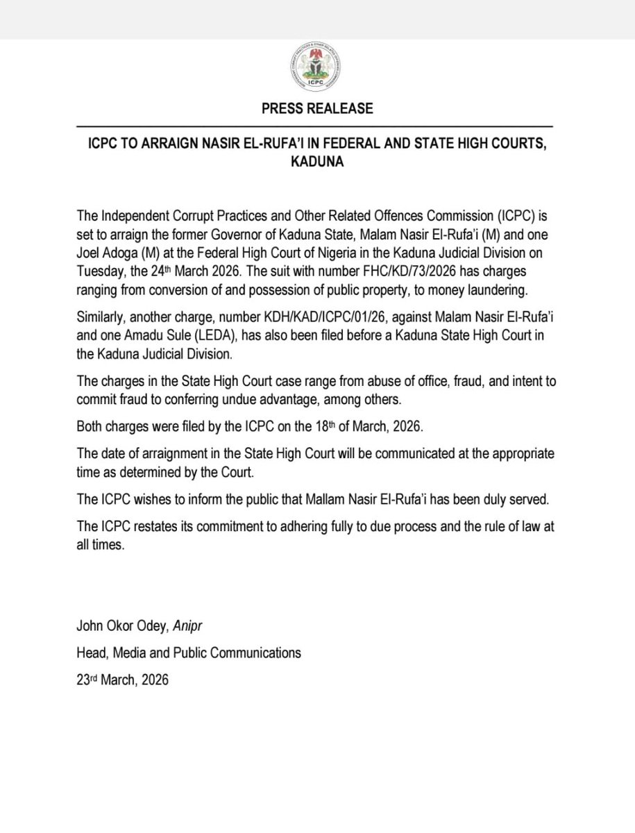 “Similarly, another charge, number KDH/KAD/ICPC/01/26, against Malam Nasir El-Rufai and one Amadu Sule (LEDA), has also been filed before a Kaduna State High Court in the Kaduna Judicial Division,” the statement reads.