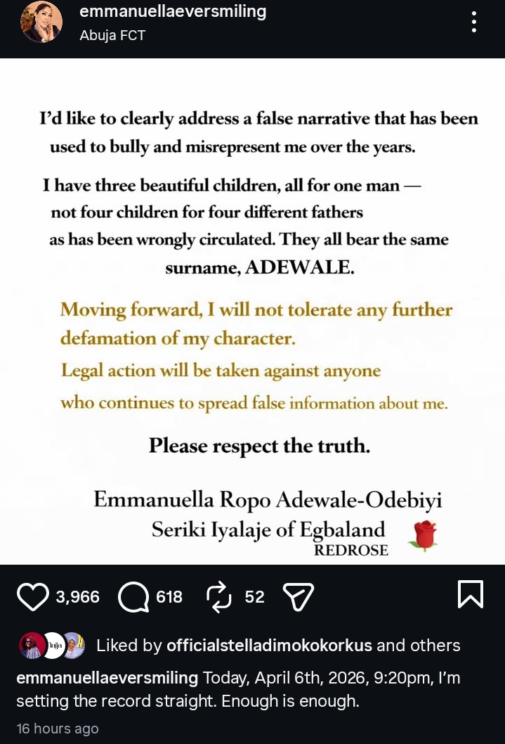 “I’d like to clearly address a false narrative that has been used to bully and misrepresent me over the years. I have three beautiful children, all for one man, not four children for four different fathers, as it is wrongly circulated. They all bear the same surname, ADEWALE.
