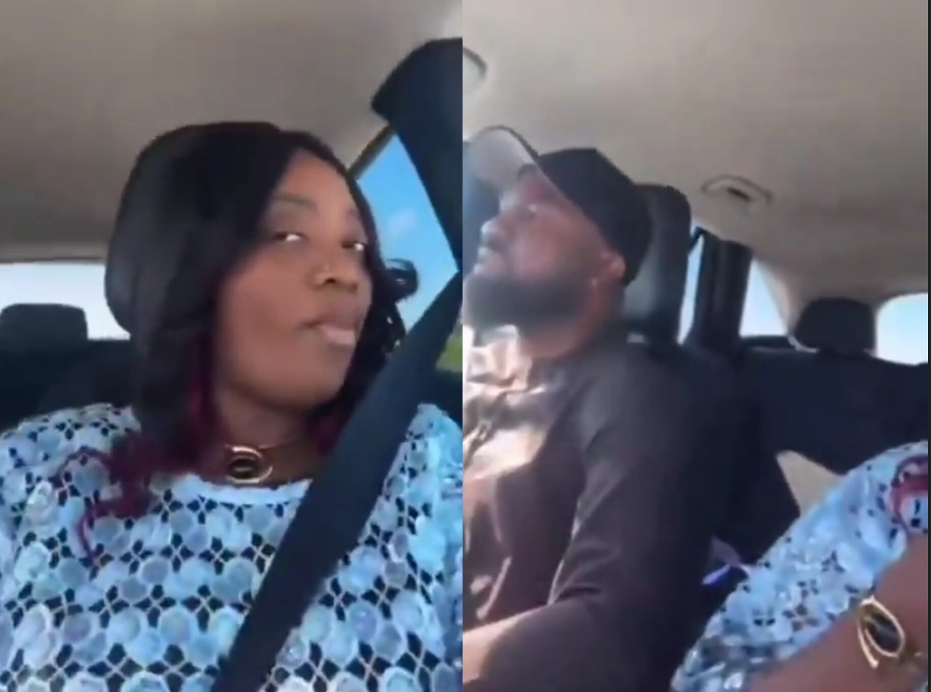 Her new partner appeared in the frame wearing a black baseball cap turned backwards and a dark brown long-sleeve traditional outfit. He also had a full, neatly kept beard, giving him a calm and composed appearance as he focused on the road.