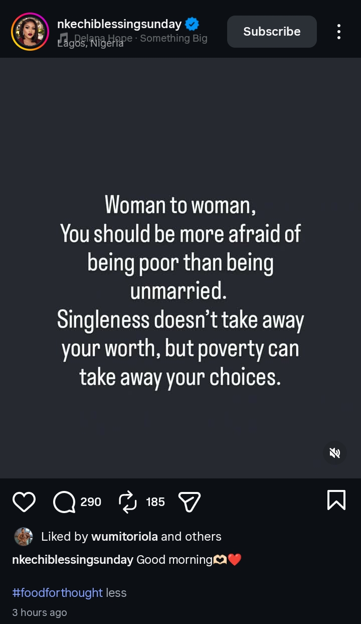 Nkechi Blessing Sunday has encouraged women to prioritize financial independence over marital status in a recent Instagram post.