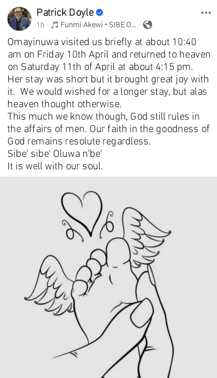 In an emotional post shared on Facebook, Doyle said Omayinuwa was born on Friday, April 10, at about 10:40 a.m., and died the following day, Saturday, April 11, at around 4:15 p.m. He described her brief life as one that brought happiness despite its tragic ending. The cause of death was not disclosed.