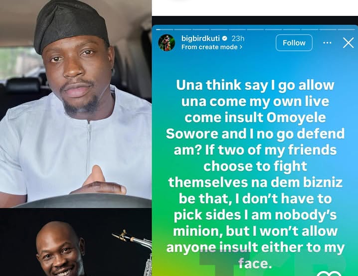 “Una think say I go allow una come my own live come insult Omoyele Sowore and I no go defend am? If two of my friends choose to fight themselves na dem bizniz be that, I don’t have to pick sides I am nobody’s minion, but I won’t allow anyone insult either to my face.”