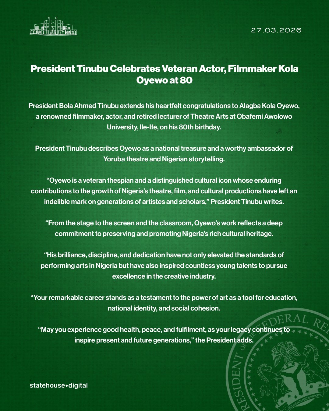 “Oyewo is a veteran thespian and a distinguished cultural icon whose enduring contributions to the growth of Nigeria’s theatre, film, and cultural productions have left an indelible mark on generations of artistes and scholars.”