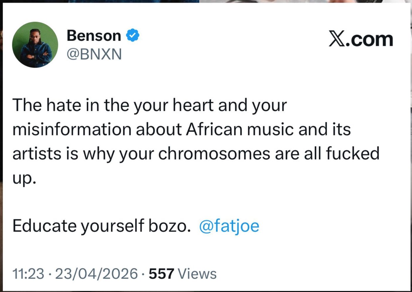 “The hate in the your heart and your misinformation about African music and its artists is why your chromosomes are all fucked up. Educate yourself bozo. @fatjoe”